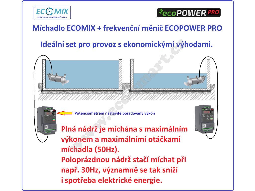 - ideálnější zapojení je s frekvenčním měničem ECOPOWER PRO s plynulým rozběhem, plynulým doběhem a možností pomalého zpětného chodu. Lze i jednoduše otočným potenciometrem/kolečkem ručně zvolit otáčky a tím i okamžitý výkon míchadla. Především při rozběhu je minimalizován rozběhový proud a tím sníženo mechanické i elektrické zatížení míchadla a eliminovány poklesy napětí v napájecí síti.